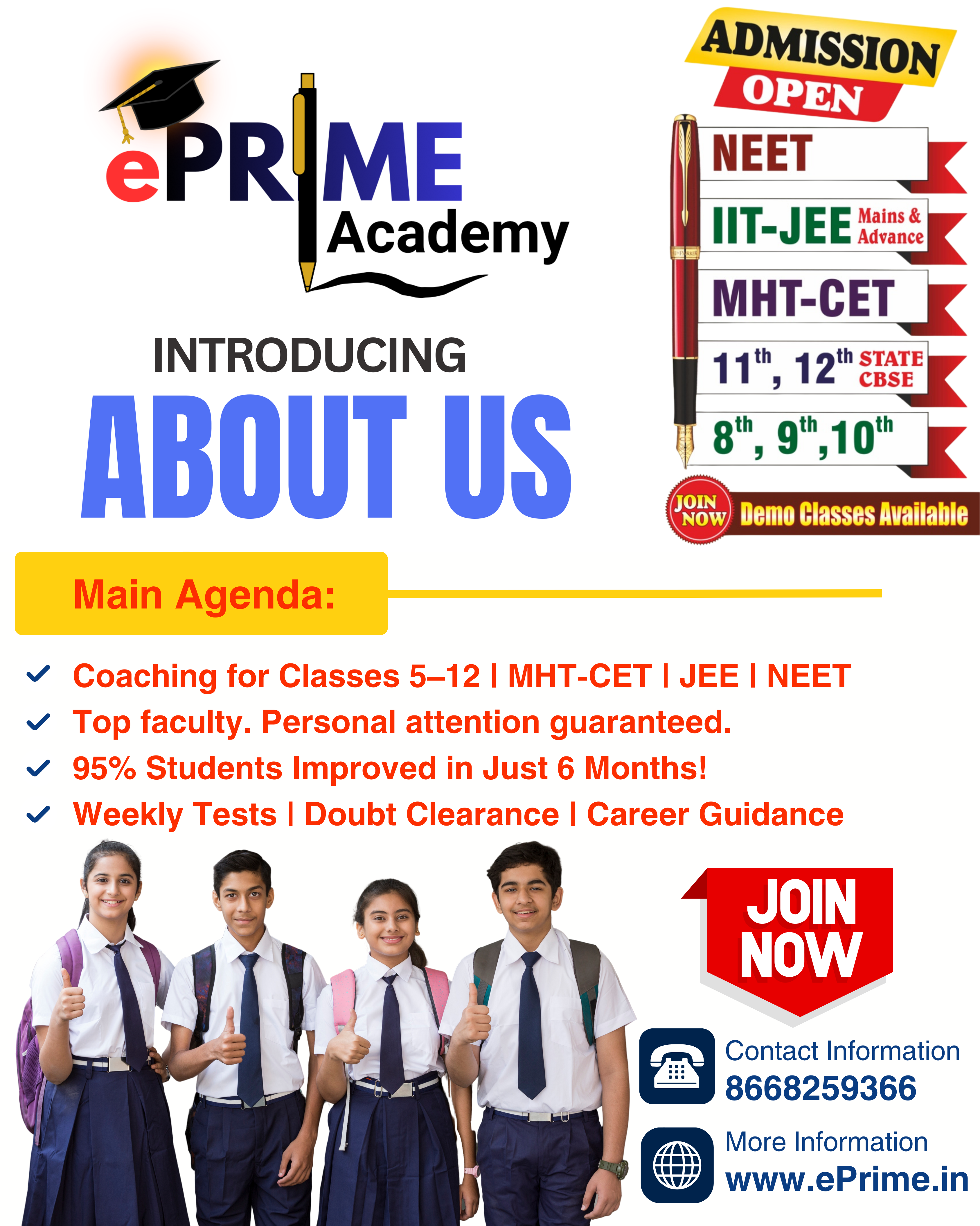 ePrime Academy offers comprehensive coaching for Classes 5th to 12th (CBSE / State Board) and competitive exam preparation for JEE (Main & Advanced), NEET, and MHT-CET. Our programs are designed to build strong fundamentals along with exam-oriented strategies.