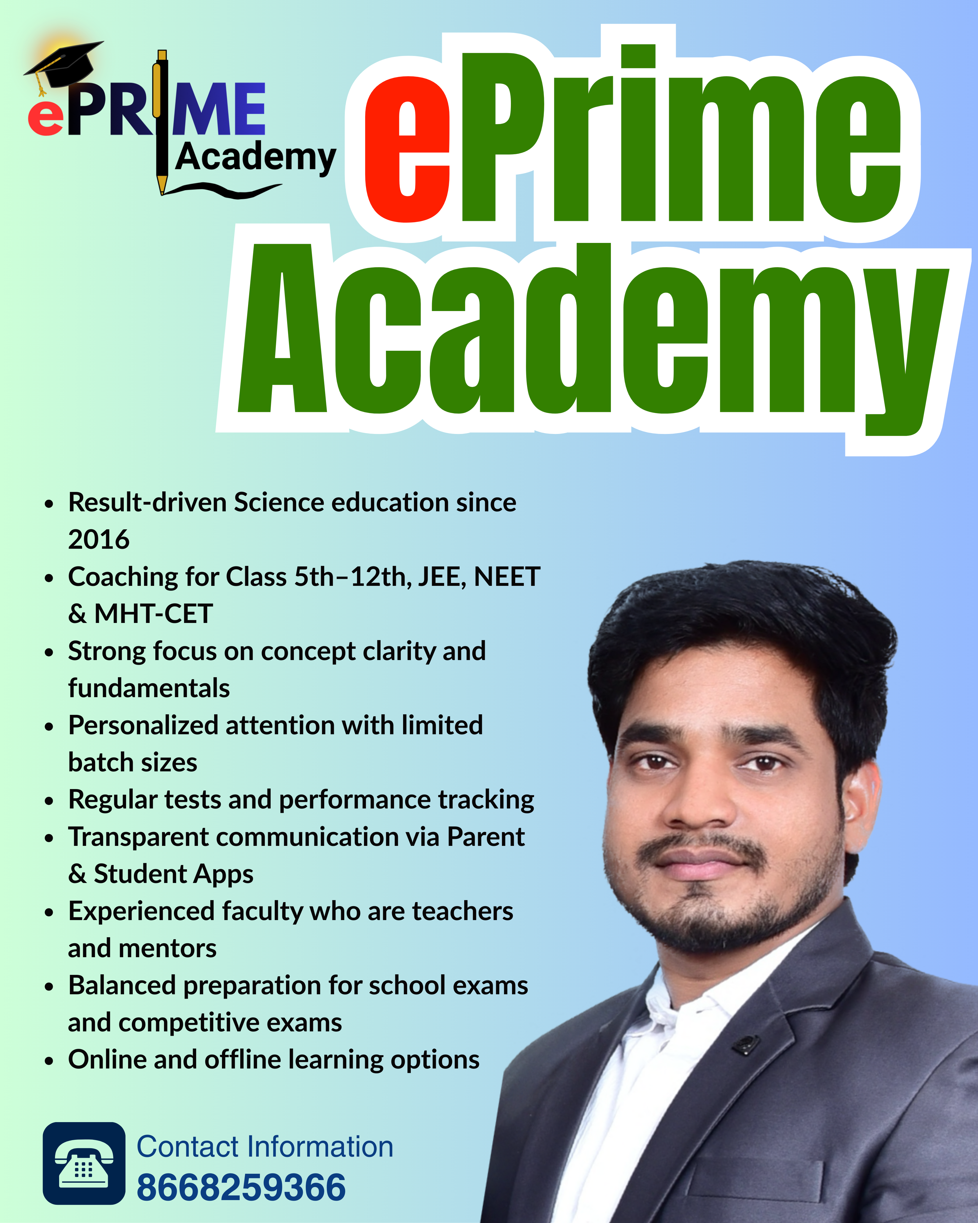 ePrime Academy is a result-oriented coaching institute delivering excellence in Science education since 2016. We provide quality coaching for Classes 5th to 12th and competitive exams including JEE, NEET, and MHT-CET.