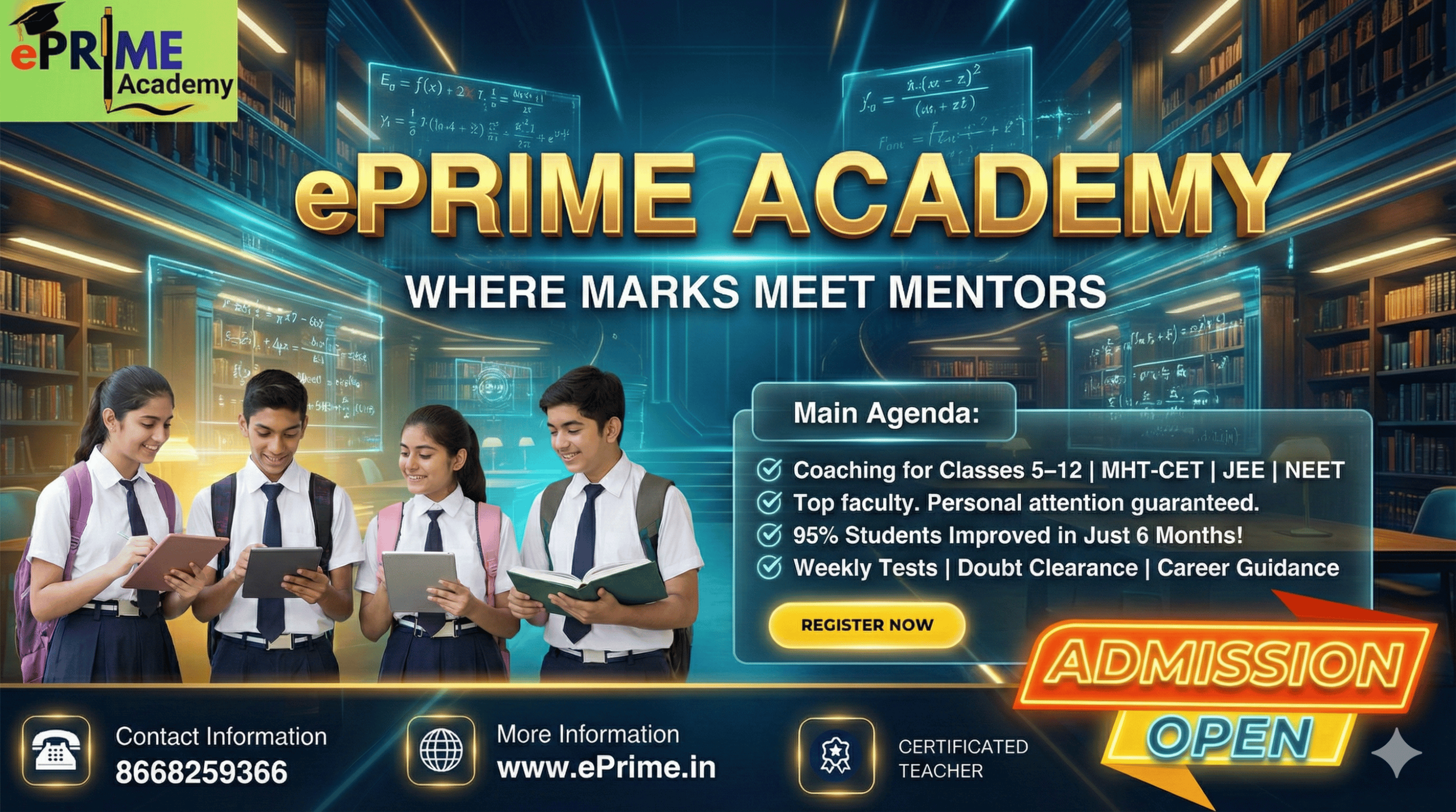 ePrime Academy is a result-oriented coaching institute delivering excellence in Science education since 2016. We provide quality coaching for Classes 5th to 12th and competitive exams including JEE, NEET, and MHT-CET.