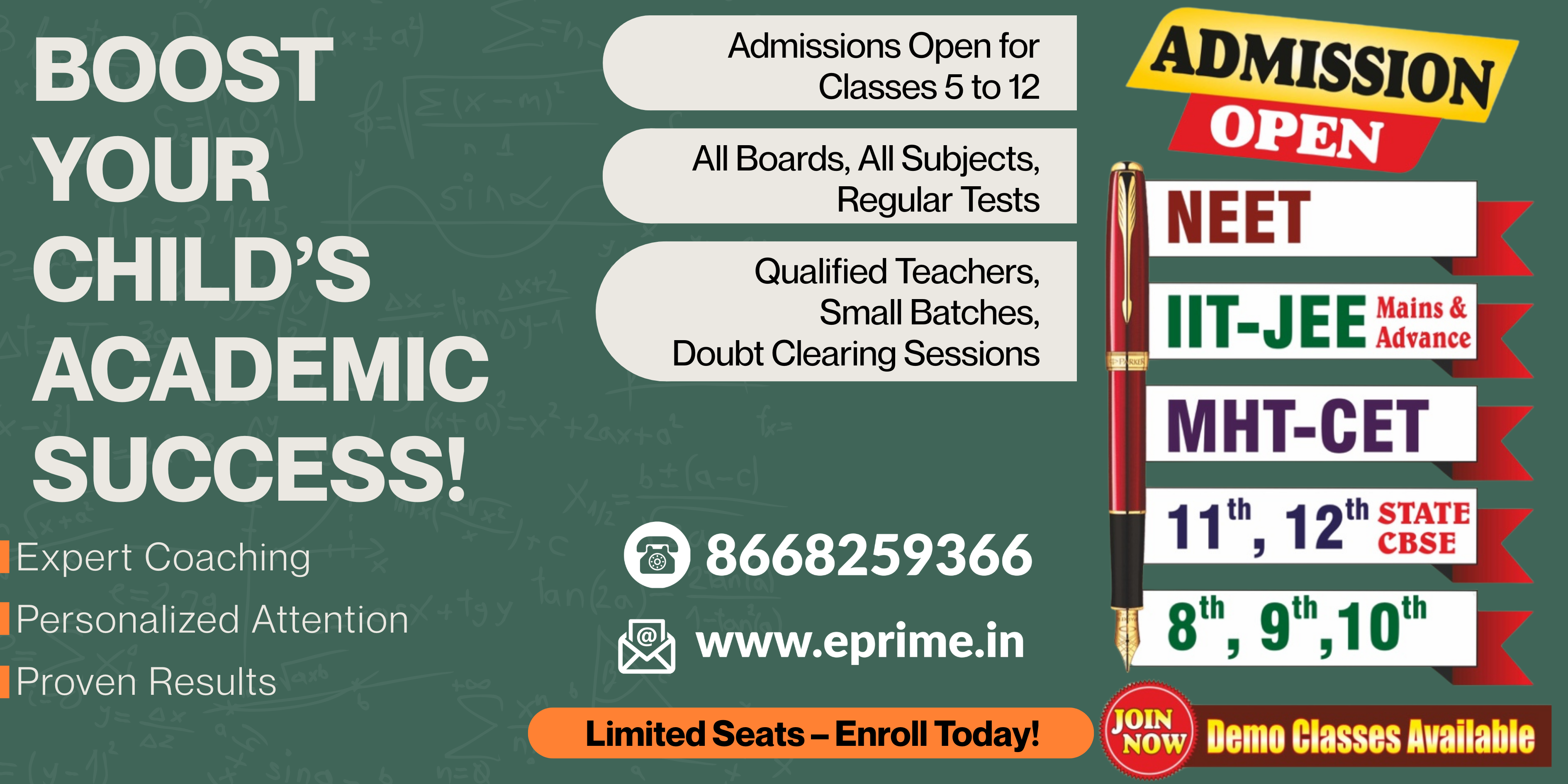 ePrime Academy offers comprehensive coaching for Classes 5th to 12th (CBSE / State Board) and competitive exam preparation for JEE (Main & Advanced), NEET, and MHT-CET. Our programs are designed to build strong fundamentals along with exam-oriented strategies.